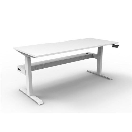 Rapidline Boost single sided manual crank height adjustable workstation with cable tray. White top with white frame.