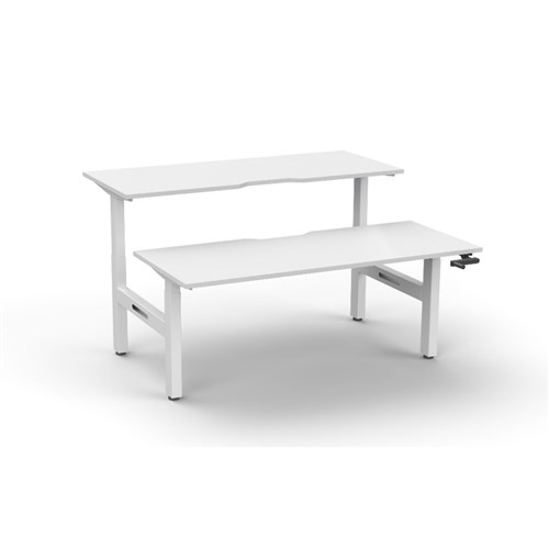 Rapidline Boost back to back 2 person manual crank height adjustable workstation. White top with white frame.