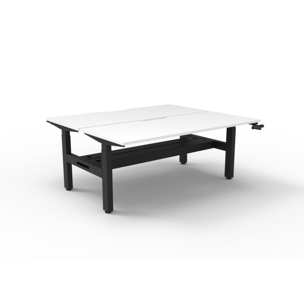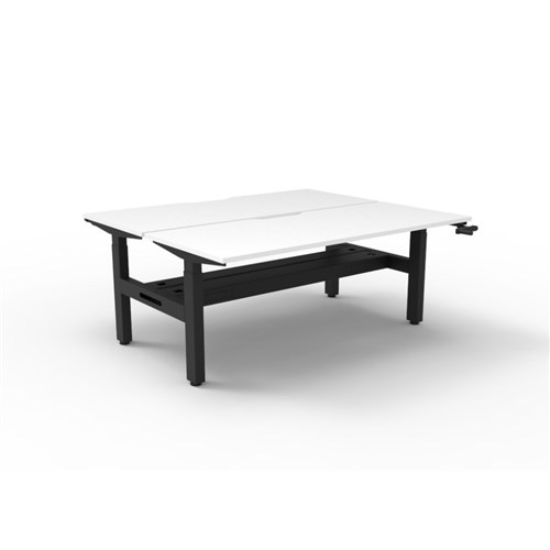 Rapidline Boost back to back 2 person manual crank height adjustable workstation with cable tray. White top with black frame.