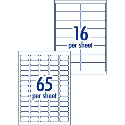 Home office label kit. 2 sizes: 99.1 x 34mm (16UP 128 labels) and 38.1 x 21.2mm (65UP 130 labels).
