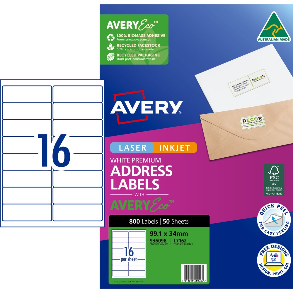 Avery Premium Address Labels White Laser Inkjet AveryEco L7162 99.1 x 34mm 16UP 800 Lab