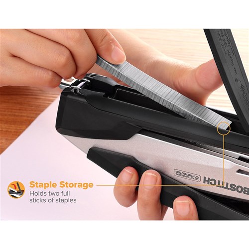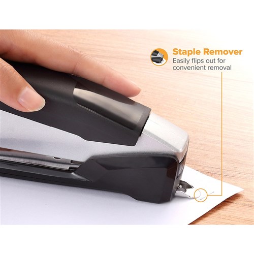 Built-in staple remover and integrated staple storage compartment for added convenience.