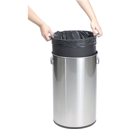 Wide lid covers trash bag completely.