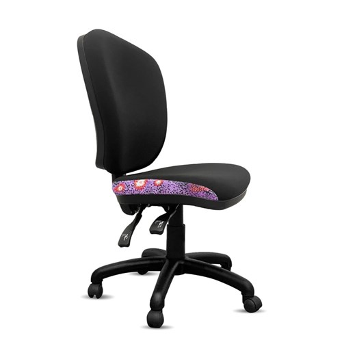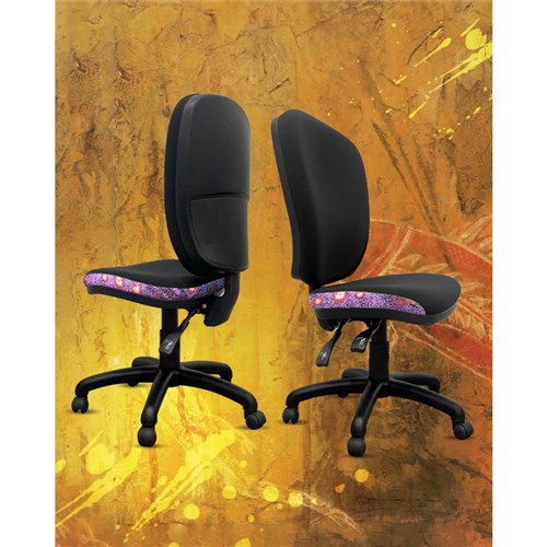 A unique commercial fabrics designed by Andrea Adamson (Indigenous Artist) combined with K2 Black Fabric to upholster the chair.