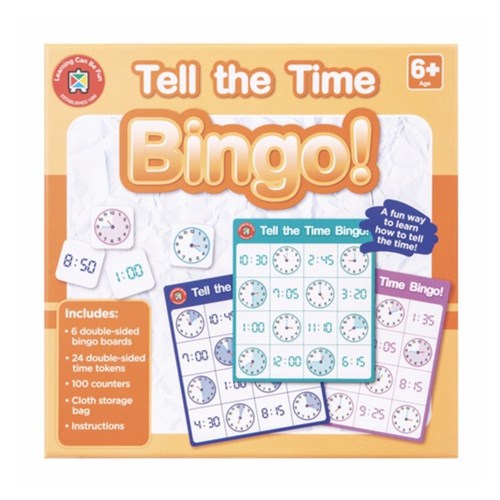 Includes: 6 double-sided bingo boards, 24 double-sided time tokens, 100 counters, cloth storage bag and instructions.