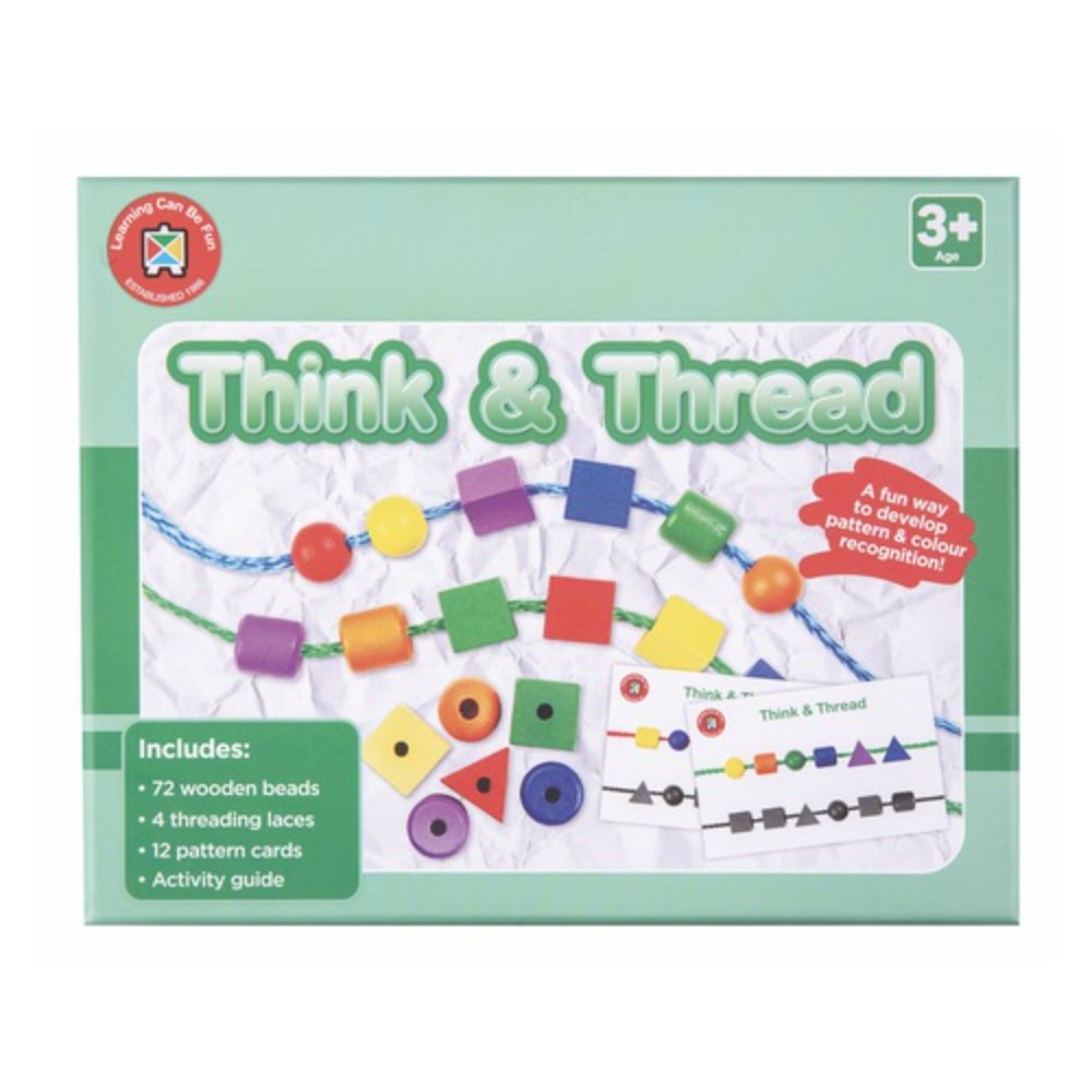 Includes: 72 wooden beads, 12 pattern cards, 4 threading laces and activity guide.
