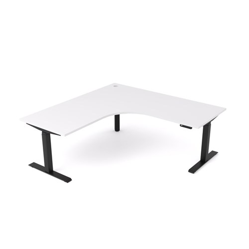 Height adjustable 90 degree workstation right hand return Black frame White top.