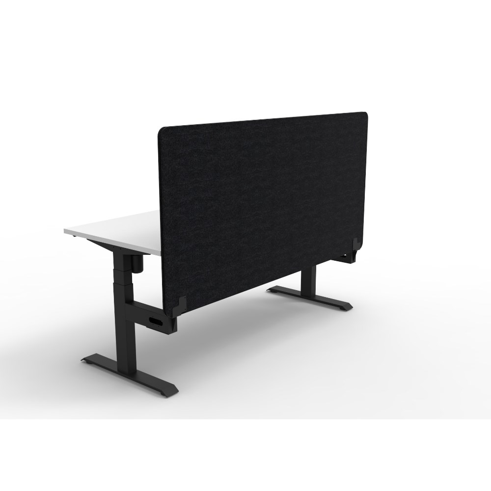 Electric height adjustable single sided workstation with Natural White top and Black Satin frame, Black Eco screen.
