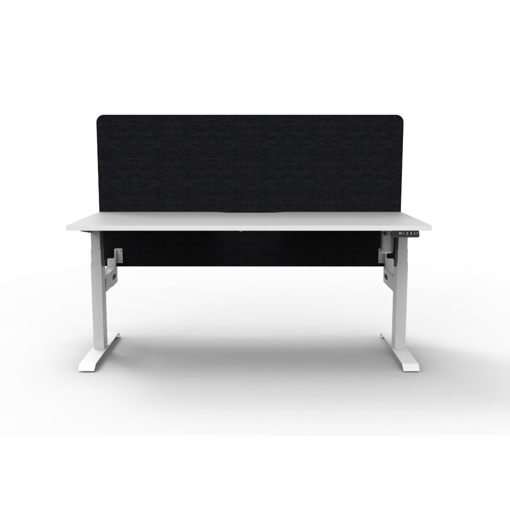 Electric height adjustable single sided workstation with Natural White top and White Satin frame, Black Eco screen.