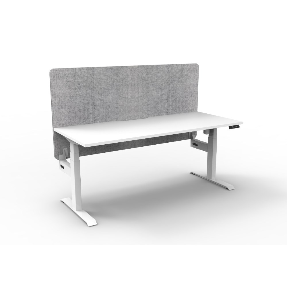 Electric height adjustable single sided workstation with Natural White top and White Satin frame, Grey Eco screen.