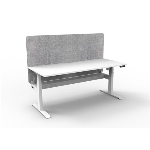 Electric height adjustable single sided workstation with Natural White top and White Satin frame, Grey Eco screen and cable tray.