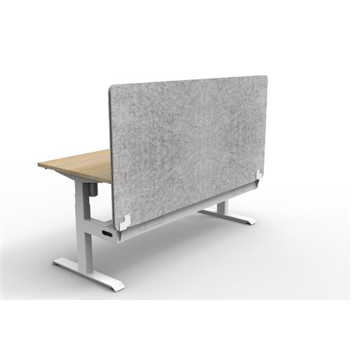 Electric height adjustable single sided workstation with Natural Oak top and White Satin frame, Grey Eco screen and cable tray.