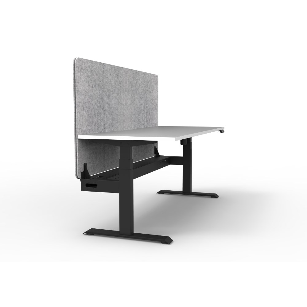 Electric height adjustable single sided workstation with Natural White top and Black Satin frame, Grey Eco screen and cable tray.