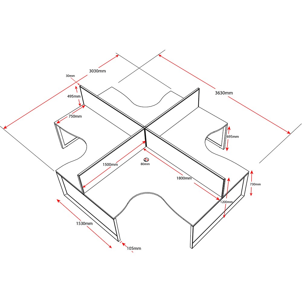 Overall Including Screen: 3630mm W x 3030mmW x 780mm D x 1200mm H. Per User: 1800mm W x 1500mmW x 750mm D. Desk Height: 730mm.