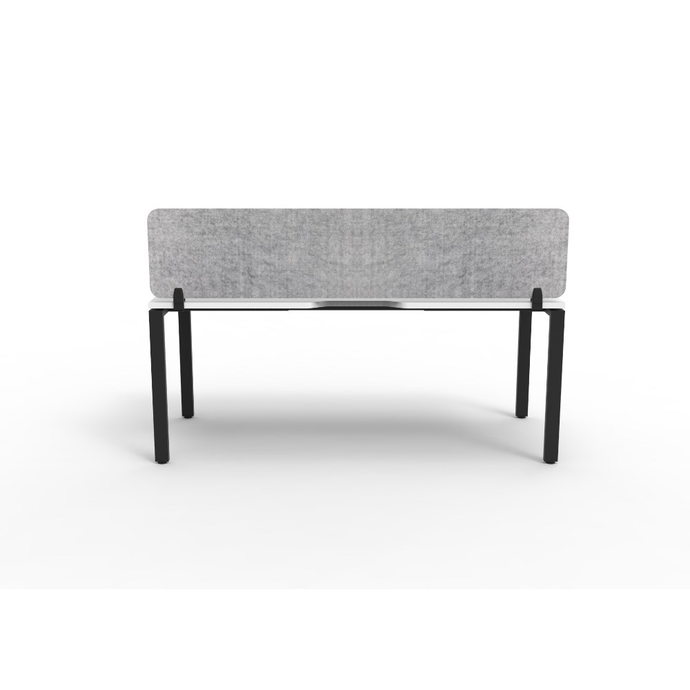 Natural White worksurface with rigid edging and 410mmW x 50mmD scallop cable access. Black Satin powder coat frame. Eco screen.