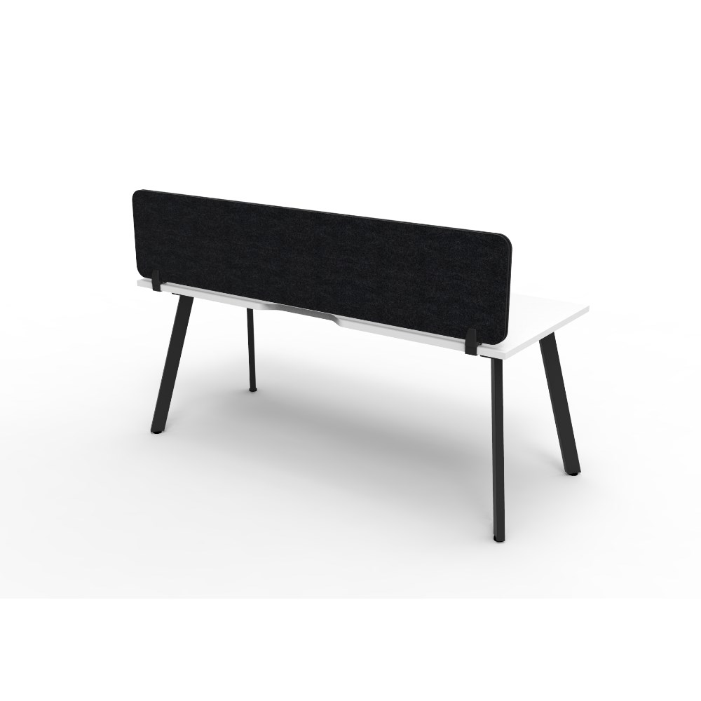Natural White worksurface with rigid edging and 410mmW x 50mmD scallop cable access. Black Satin powder coat frame. Eco screen.