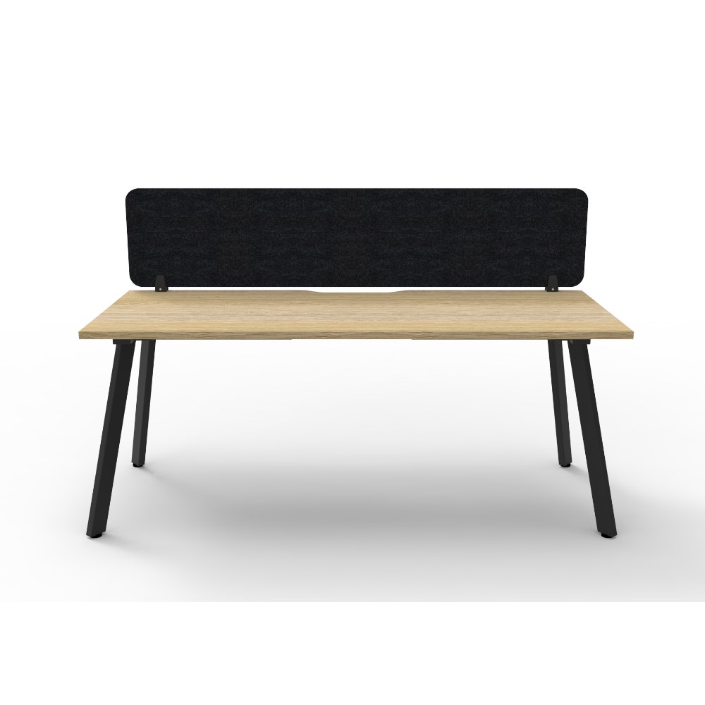 Natural Oak worksurface with rigid edging and 410mmW x 50mmD scallop cable access. Black Satin powder coat frame. Eco screen.