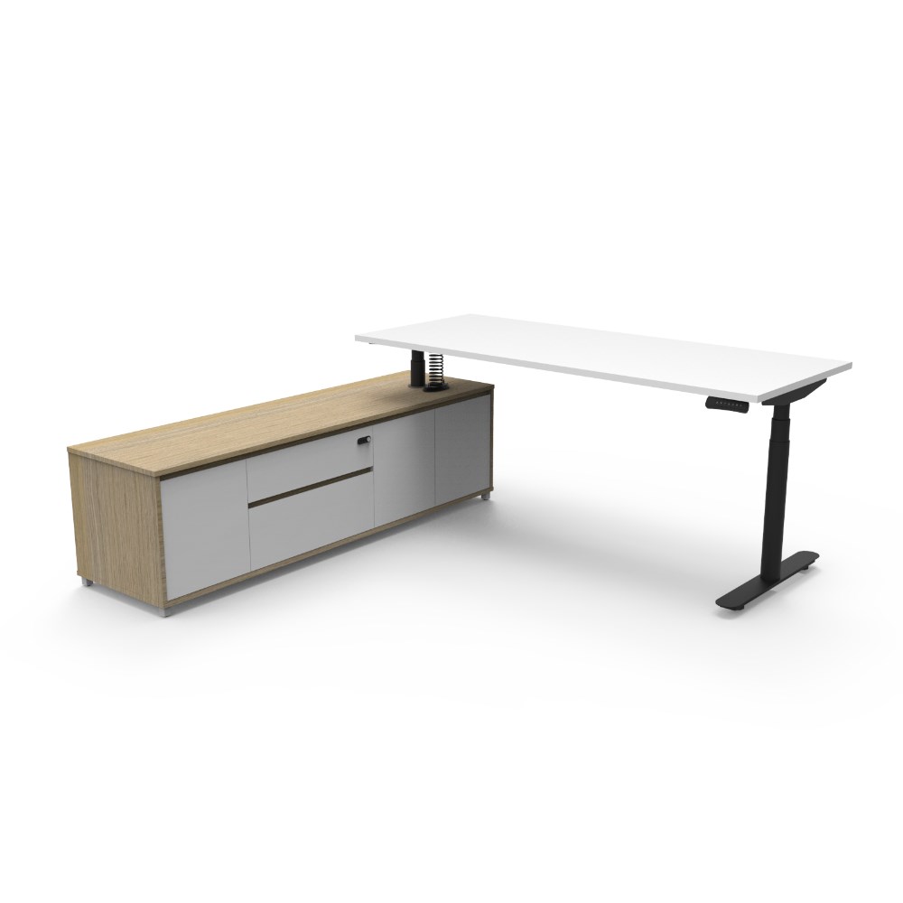 Natural White top and Black Satin frame. Height adjustable desk with left hand side cabinet.