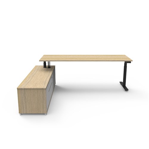Natural Oak top and Black Satin frame. Height adjustable desk with left hand side cabinet.