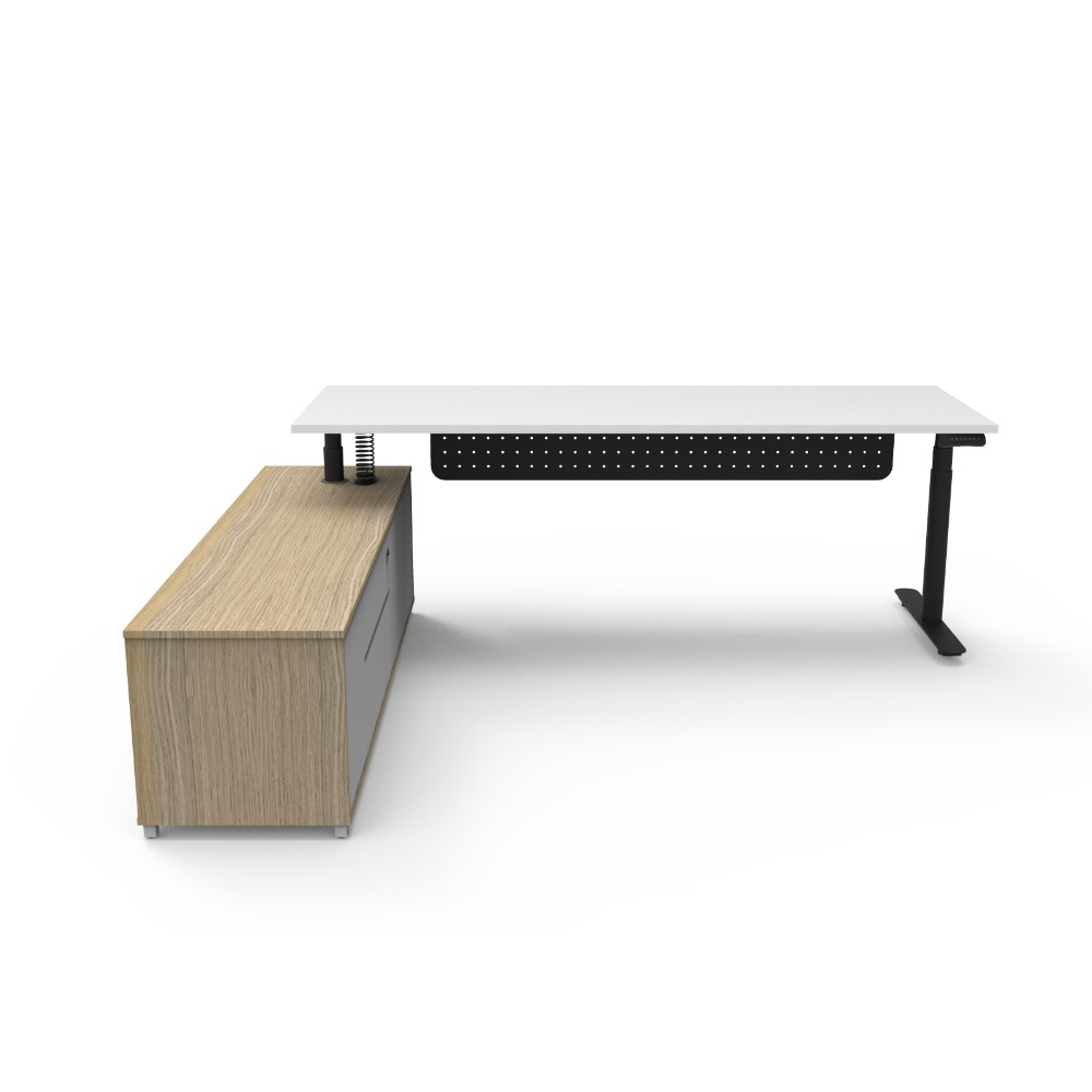 Natural White top and Black Satin frame. Height adjustable desk with modesty panel and left hand side cabinet.