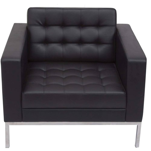 Elegant reception area arm chair with button finish to black PU, easy clean upholstery.