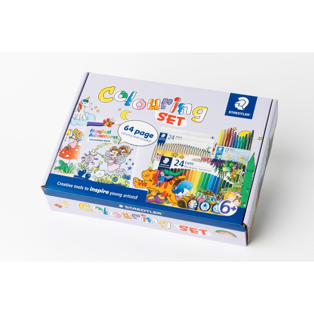 Includes 64 page colouring book, 24 Natural Coloured Hexagonal Pencils, 12 Noris Wax Twister Crayons and 24 Luna Fibre-Tip Pens.