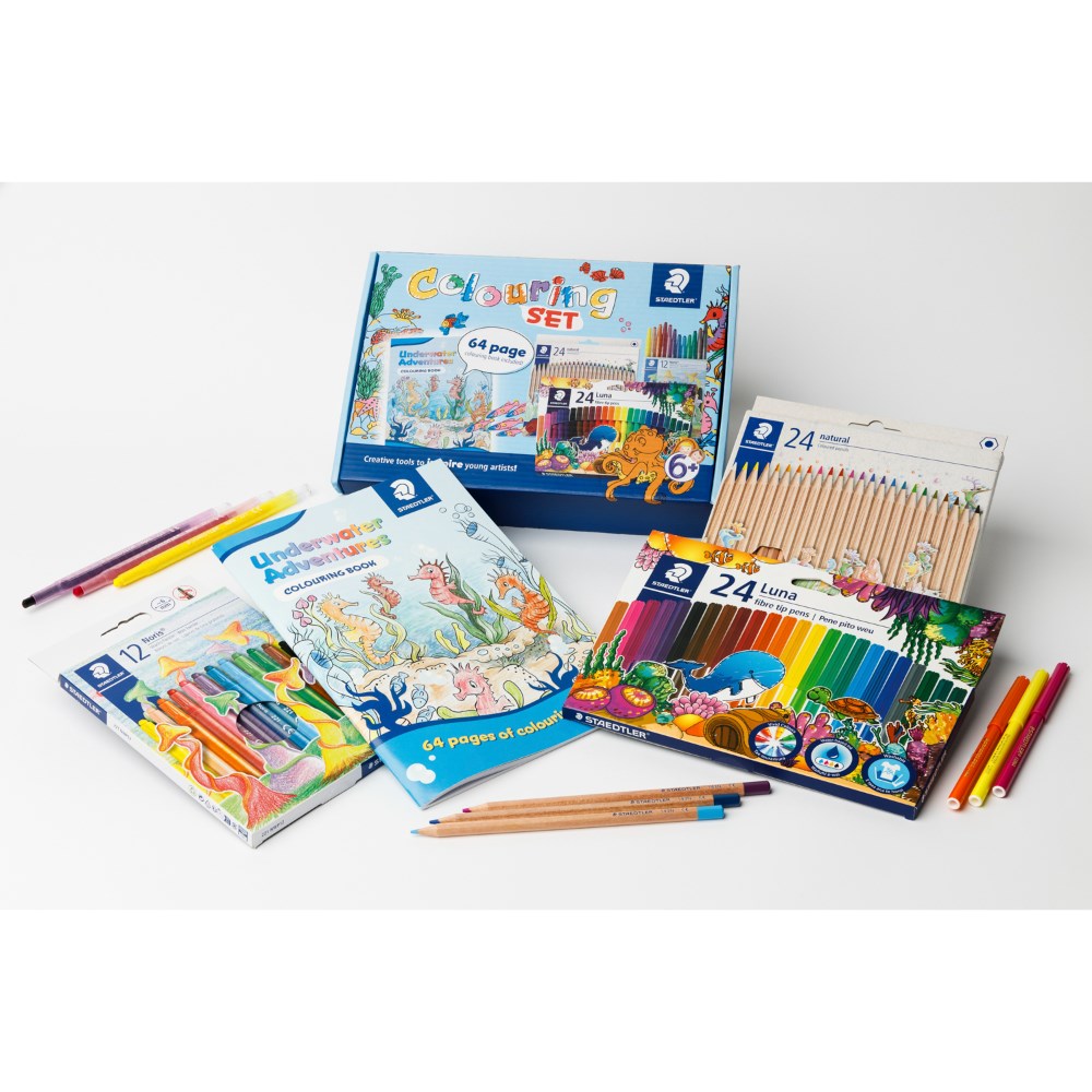 Includes 64 page colouring book, 24 Natural Coloured Hexagonal Pencils, 12 Noris Wax Twister Crayons and 24 Luna Fibre-Tip Pens.