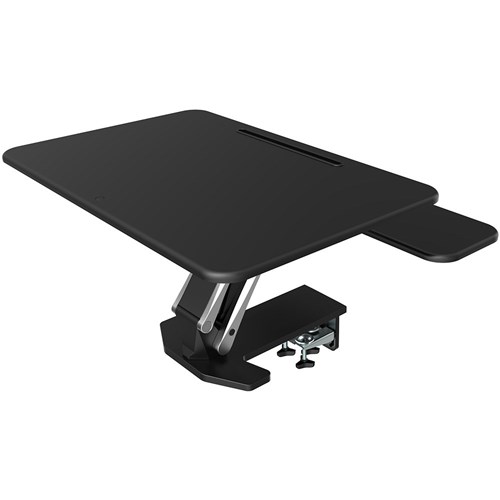 Attaches to the front edge of any surface and provides a one handle easy adjustable sit stand work surface.