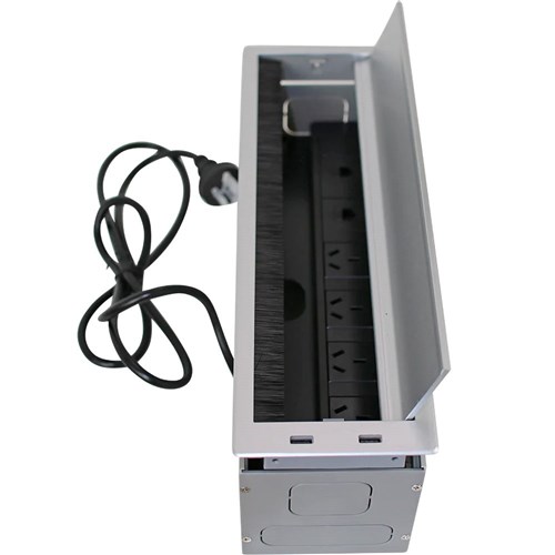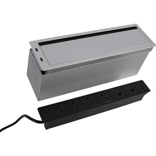 Embedded into the desk to keep the top access to the?power board?flush?with the table surface. When not in use, the lid?closes?to?conceal the?power board.?.