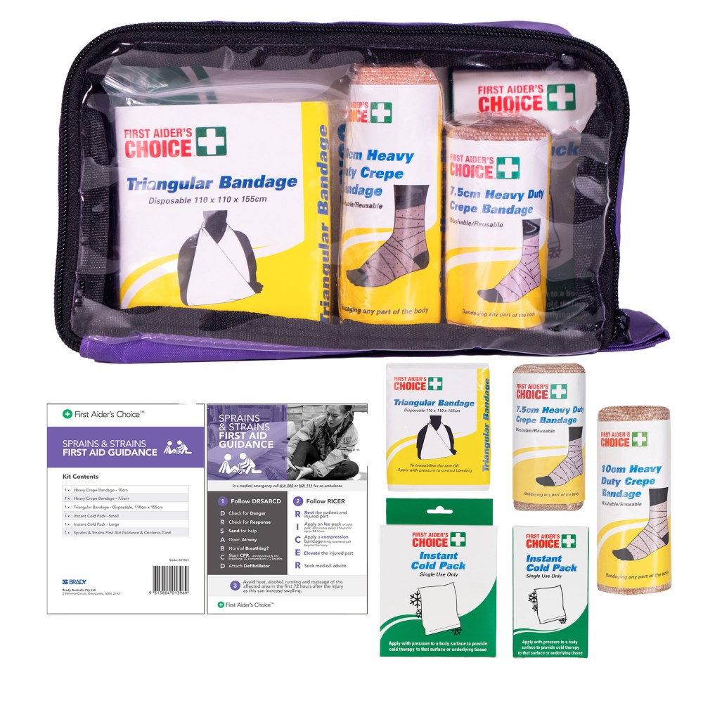Contents: 1x Bandage Heavy Crepe 10cm x 2m, 1x Bandage Heavy Crepe 7.5cm x 2m, 1x Bandage Triangular 110cm x 155cm, 1x Large and 1x Small ice pack and Guidance and Content Card.